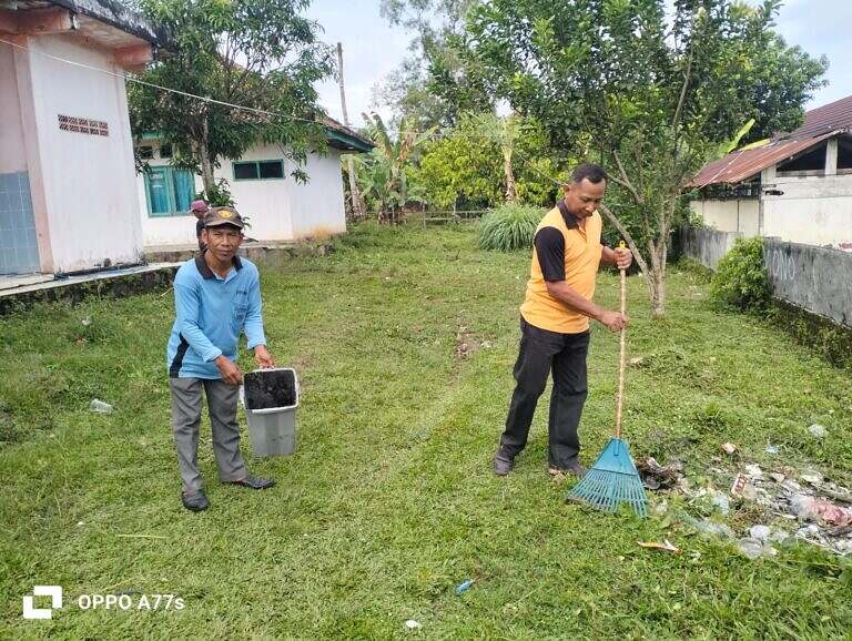 Selain membersihkan sampah dan dedaunan kering, kegiatan ini juga menjadi momen untuk melakukan pengecekan dan perbaikan kecil pada fasilitas umum di sekitar kantor desa, seperti memperbaiki tempat sampah yang rusak dan menata ulang tanaman hias agar lebih rapi.